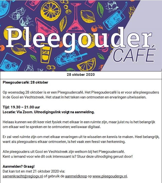 Op woensdag 28 oktober is er van 19.30-21.00 een online Pleegoudercafé. Het Pleegoudercafé is er voor alle pleegouders in de Gooi en Vechtstreek. Het staat in het teken van ontmoeten en ervaringen uitwisselen. Ben je pleegouder en wil je ook aanwezig zijn? Meld je dan aan door een mail te sturen naar samenkracht@regiogv.nl of ga naar www.pleegoudergv.nl. Na aanmelding ontvang je de link om deel te nemen.